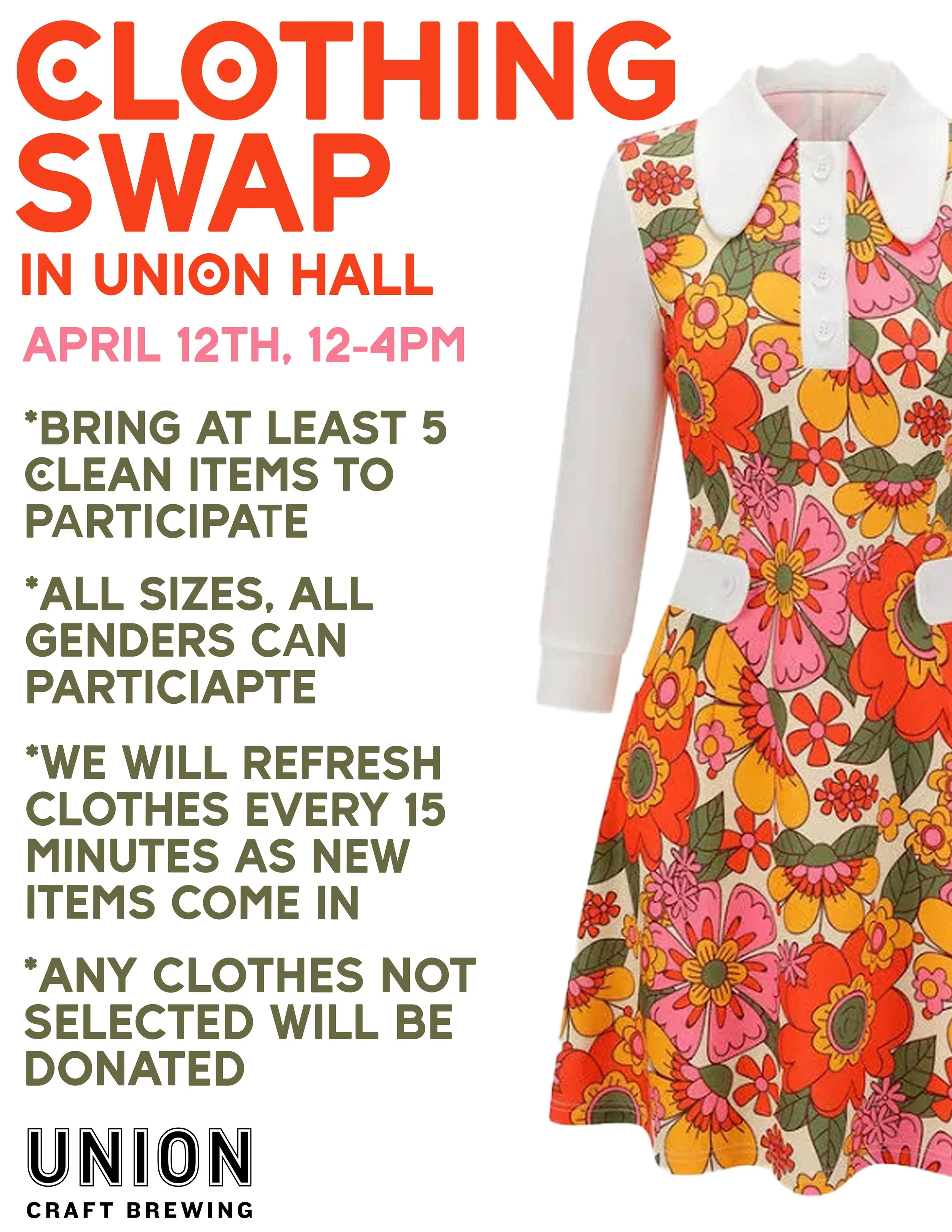 Come join us for a Clothing Swap at Union Hall. Bring your old clothes and take home new-to-you clothes. All left over clothes will be donated.